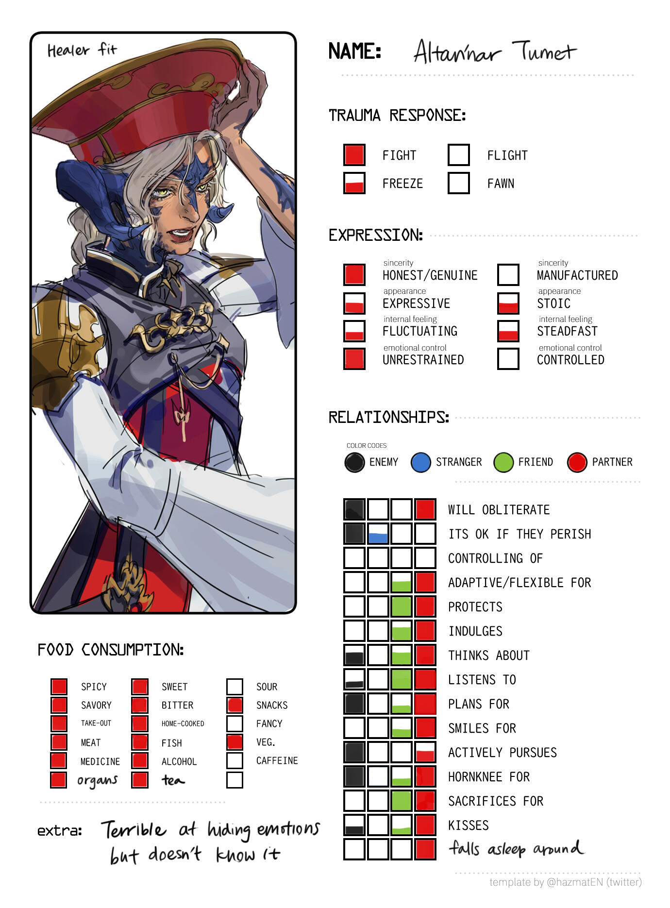 - Tao-hann has never cussed, once, in his entire life. (And he never will!)- He loves goobues with his entire heart, and thinks they're adorable. He has a goobbue sproutling companion named Joppa, and a fully grown counterpart which he named Big Joppa. This is the root of his title of "Goob Lord".- Tao-hann blushes with his entire face, including his ears.- He has a massive crush on his ninja guildmaster Oboro, but he's currently mistaking it for feelings of admiration instead. (He does not know that he is gay.)- He's become great friends with a younger lad named Wilred, whom he met on a quest. Tao-hann treats Wilred like the little brother he never had.- He named his company chocobo Sloppa.- Tao-hann doesn't drink for the most part, though he'll partake occasionally. As a drunk, he just passes out - but he'll mutter secrets in his sleep. (This is why he doesn't drink most of the time.)- He has a very high body temperature, to the point where hot steam can be seen wafting off his body in colder weather. This is why he wears a lot of revealing clothing.