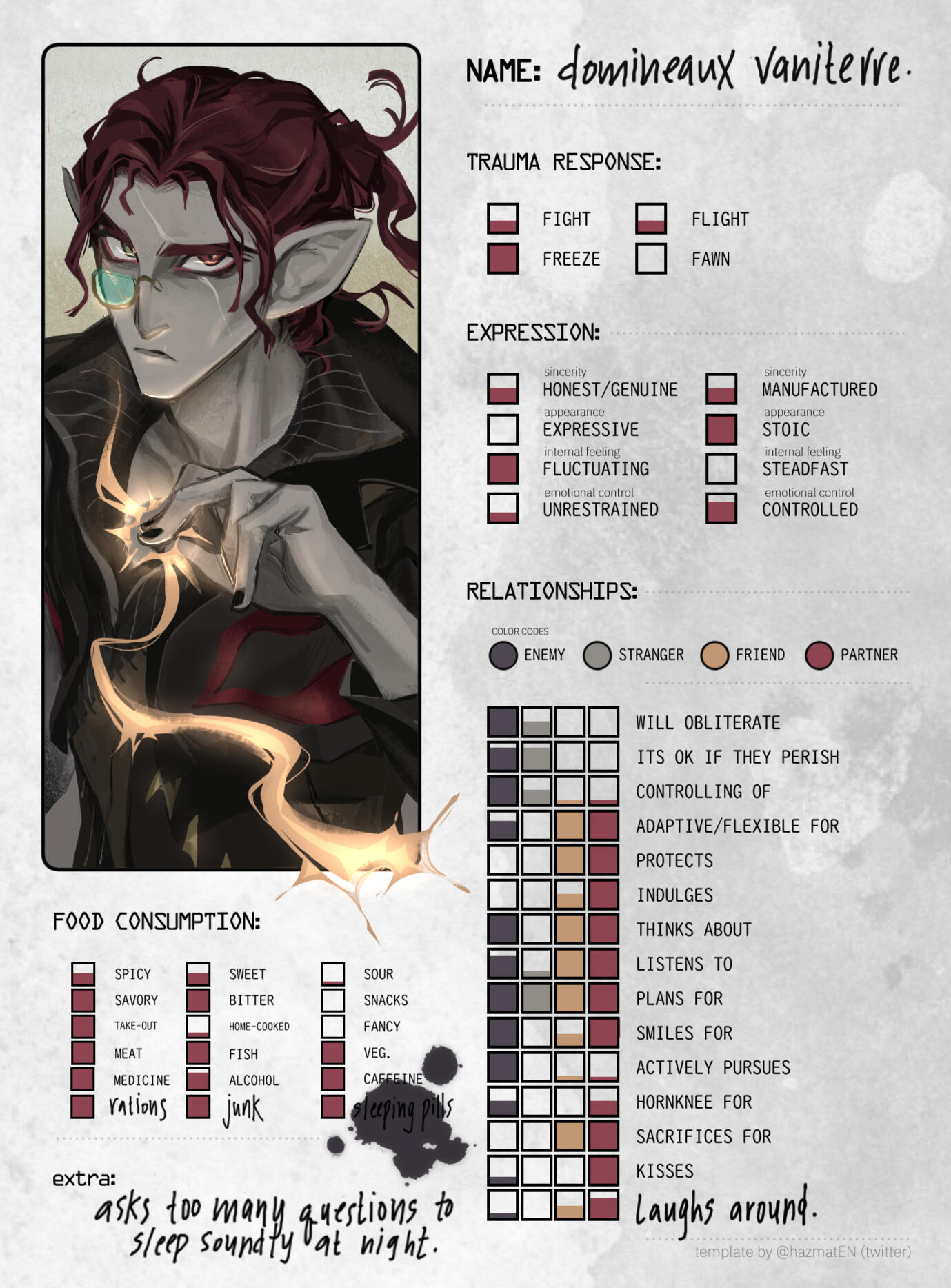 Dom has an unhealthy appetite/curiosity for all things dark and unknown. Heard an interesting rumor about some forbidden text or have a harrowing brush with the supernatural? Tell him all about it, and he might even reward your tale with coin. (No promises on his part to not follow in your footsteps or to stay away from said objects.)SHUTEYE.